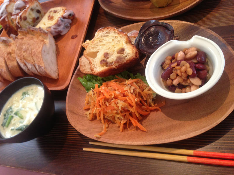 今回はフランスパン、人参とツナのサラダ、3種の豆のマリネ、菜の花の豆乳スープ、ミニフォンダンショコラです♪