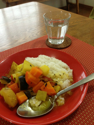 ミックスサブジの作り要領で、野菜が玉ねぎ少々とトマト、人参、じゃがいもでナスがなし。